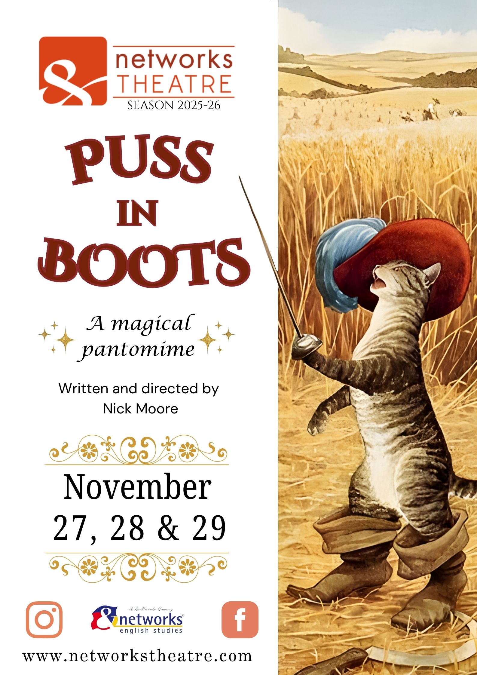 If there’s something that characterises our theatre, it’s our dedication to pantomime. Like many other venues across the UK, we’re always thrilled to bring a panto to the stage each year — and this time it’s Puss in Boots! A fun-filled story about a poor boy who inherits a talking cat and ends up becoming the prince of the kingdom! In this show, you’ll find everything that makes a traditional panto so special: music, dancing, jokes, the goodie, the baddie, the dame, and so much more! Tickets are available from the beginning of November on our website.
